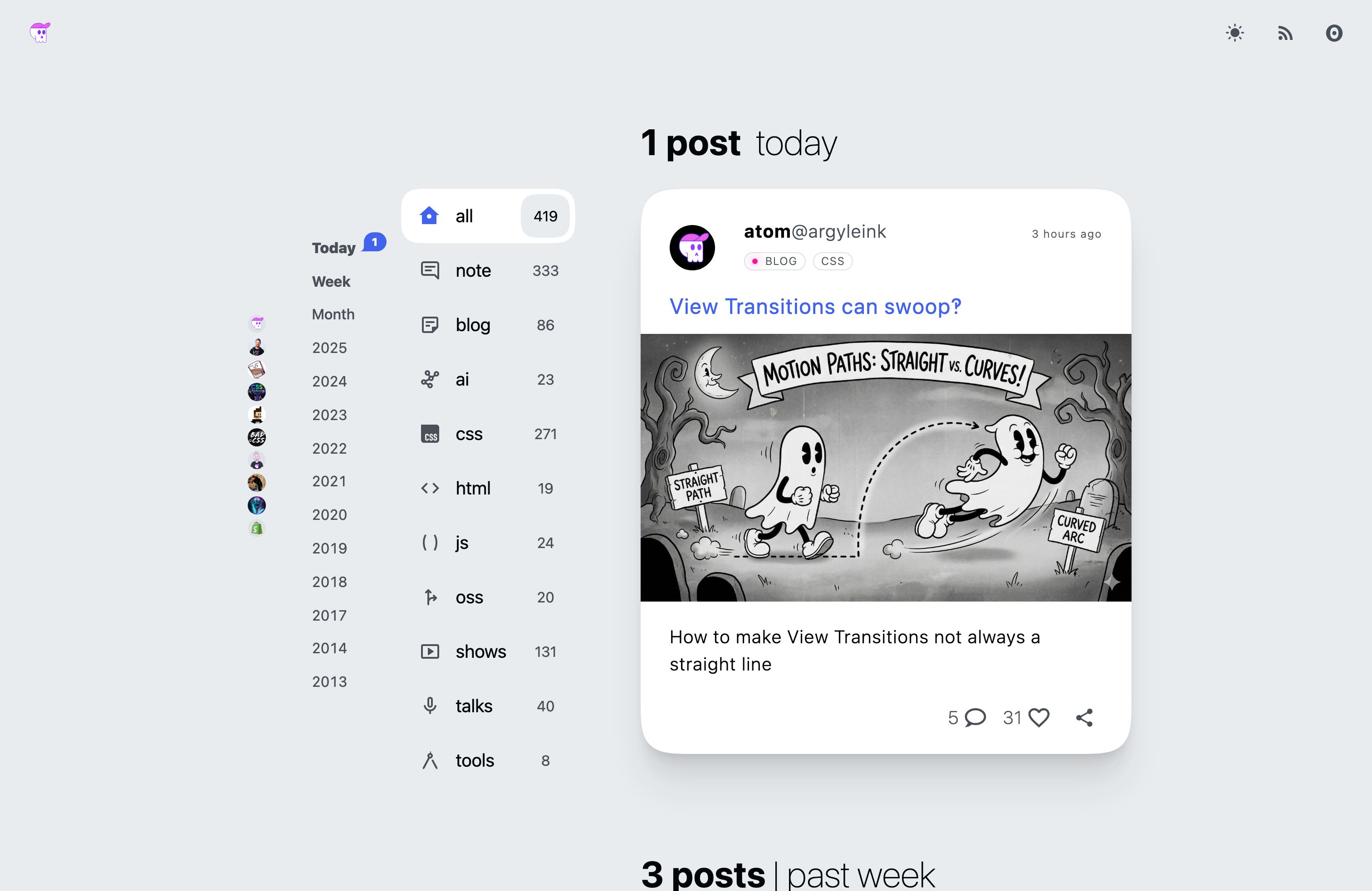 Like Zoolander who can't turn right, I thought View Transitions couldn't swoop. I had been under the impression that they couldn't curve towards the destination, and it was one of those things that you like can't unsee. All view transitions going in straight lines… CodePen All my prior attempts had failed, til now. The way of the swoop # When you give something a view-transition-name like: #ball1 { view-transition-name: view-tra